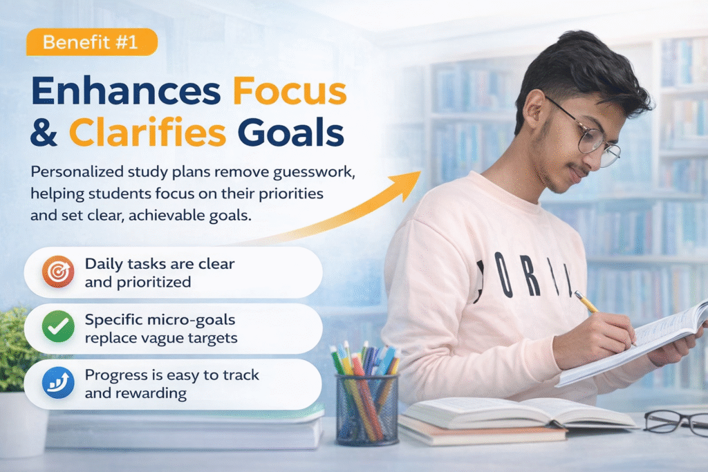 Focus is the ability to direct attention toward specific tasks while minimizing distractions. A personalized study plan forces students to outline exactly what they need to learn and when. This clarity dramatically improves focus because: